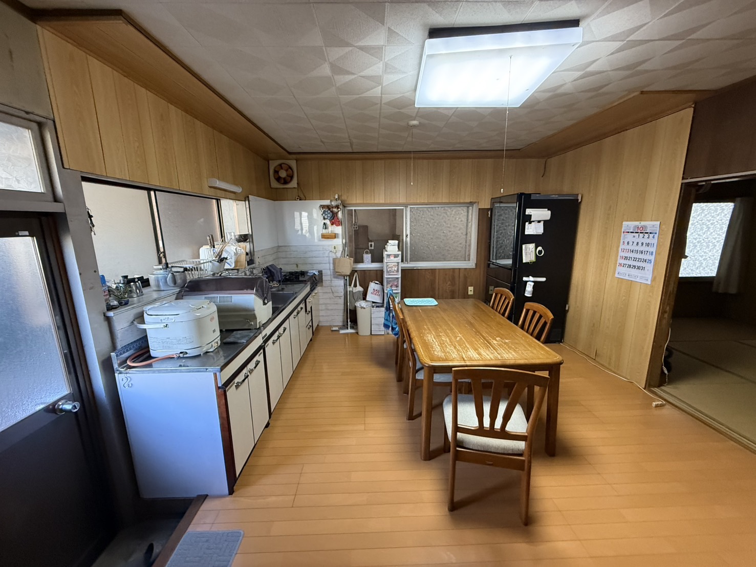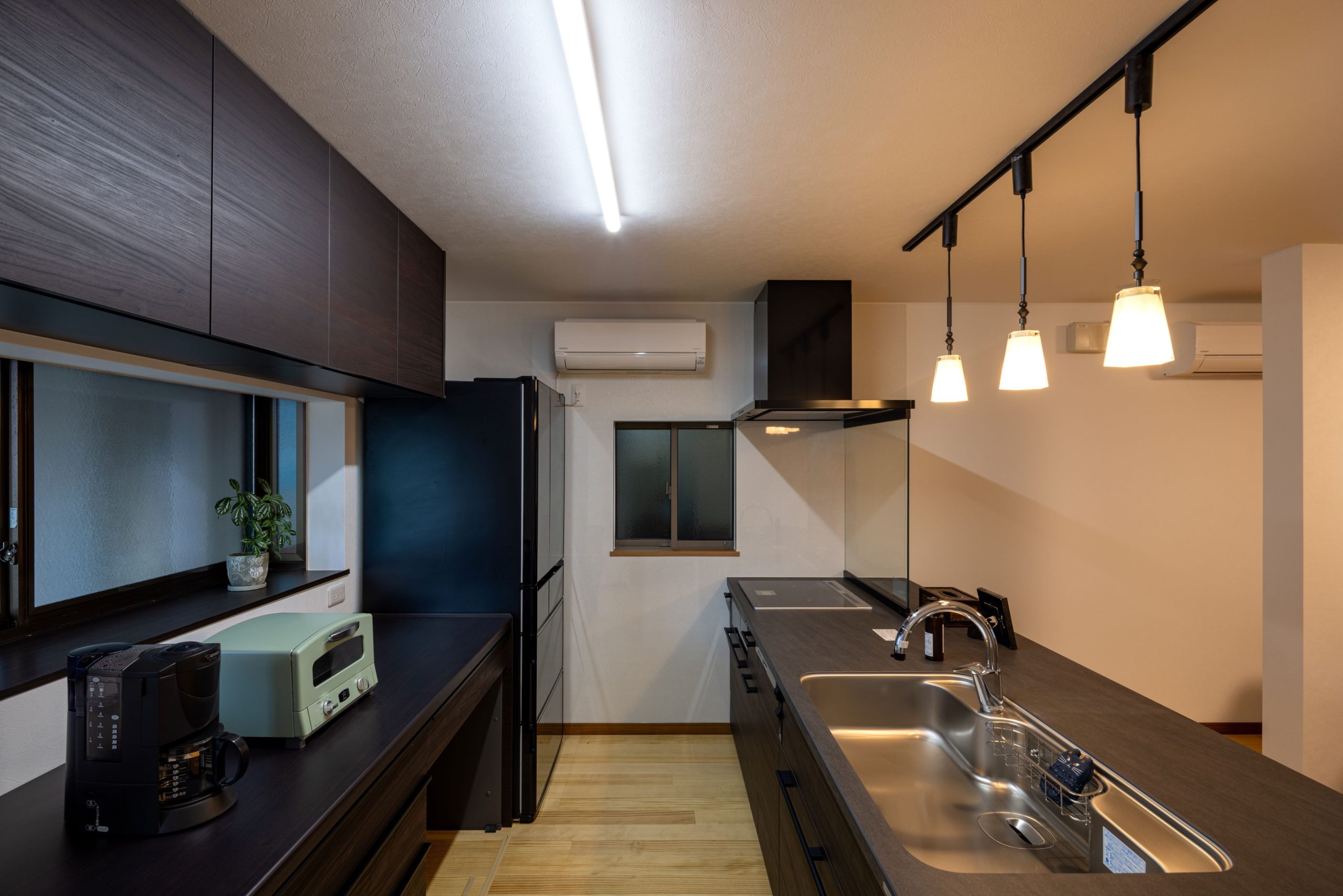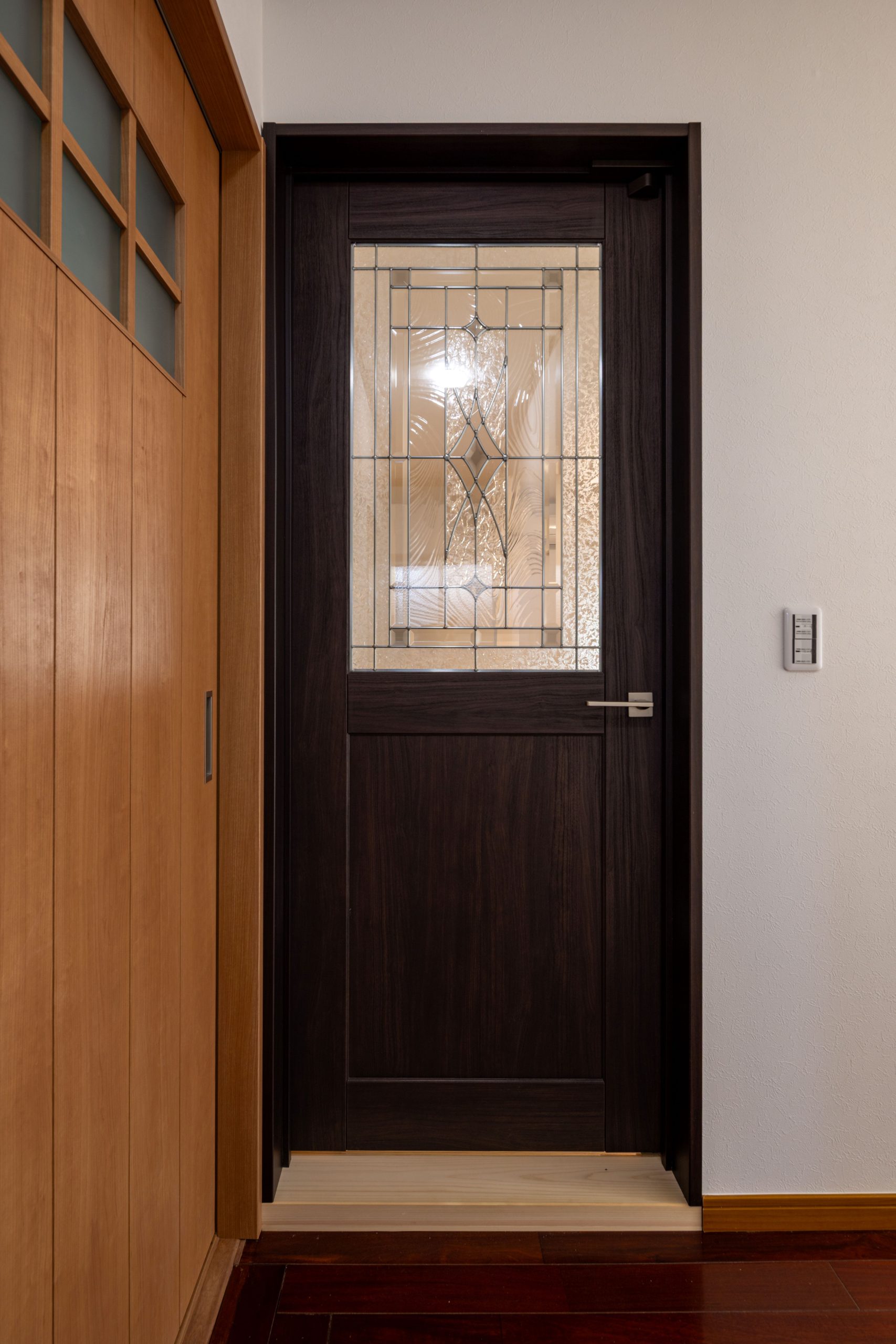 キッチンと続きの和室を一体化し、既存の仏間を拡張したLDKへと再構成。奥の和室との間には三枚引戸を設置し、普段は個室として、来客時には全開放して大きな空間として使えるようにしました。施主様お気に入りのステンドガラス入りの建具は、ダークカラーのキッチンに合わせ、シックな空間の中に華やかさを添えています。