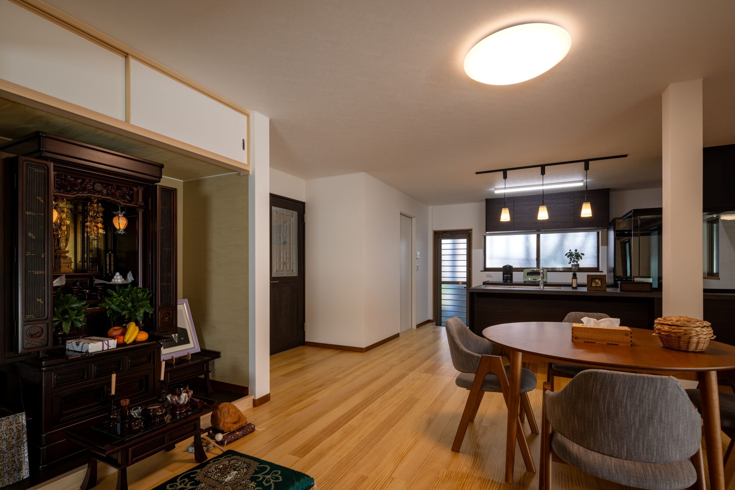 冬場の寒さを和らげたいこと、そしてご先祖様との時間を大切にしながらご家族が集える空間にしたいという施主様のご要望を受け、1階部分の改修を行いました。お仏壇を中心に、娘様やお孫様が遊びに来られた際にも、ゆったりと過ごせる広がりのある空間づくりを目指しました。